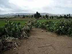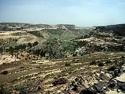 The elevation of this woreda varies from 918 to 3069 meters above sea level.[1] Rivers in Atsi Wenberta are seasonal and flow only during the rainy season. There is no lake but there are small streams and ponds. The soil is seriously degraded, and there is hardly any forest or woodland, with the notable exception of north Tigray's largest forest on the Rift Valley shoulder and on the escarpment towards the Danakil depression: the Des'a forest. Irrigation is used in the few places where it is possible; the suitable sites are rare. On many slopes the soil is so highly eroded that even when rain falls, it can retain only a small amount of moisture.[2] Nine of the 16 peasant associations in Atsbi Wenberta have an elevation of 2600 meters or higher, and are planted in barley, wheat, pulses like faba beans, and small ruminants like sheep are raised. The other seven peasant associations have an elevation below 2600 meters and are planted in teff, wheat, and barley, and both livestock and apiculture are cultivated; 6729 bee colonies are reported in this woreda. A major cash crop are faba beans, and Atsi Wenbarta is an important supplier of sheep and goats for meat to the nearby towns of Wukro, Adigrat, and the city of Mekelle.[1]