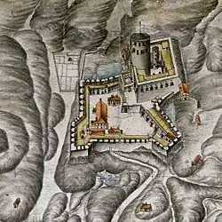 During the hearing, Danckwardt mentioned that a few volunteers from the ship crews and the garrison had left the fortress to "overwhelm the enemy" but could not get any further than the castle hill, since enemy soldiers were deployed around Marstrand cemetery, which was close by. The force of volunteers promptly turned back and re-entered the fortress, according to Danckwardt.[23] In the afternoon, firing on Carlsten continued from the mortar batteries on Koön. A shed which was being used as temporary gunpowder storage was hit and exploded. A fire also broke out on the tower roof and on parts of Fyrkantsbatteriet, an outwork on the eastern side of the fortress, which were put out by fortress personnel. No deaths were reported as a result of the artillery fire but Swedish morale was depressed because of the Danish conquering of their outworks and the sinking of the Swedish fleet. On the night to Monday, Tordenskjold landed 200 soldiers on Marstrand island, 500 men in total.[24]