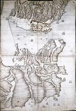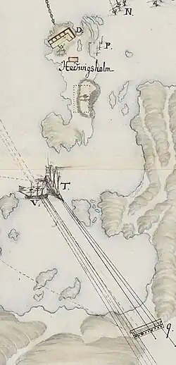 In his letter to Danckwardt, Tordenskjold mentions that he was awaiting reinforcements of 2,000 men which were deployed on the Koster Islands. Rothe's version of the same document mentions that the reinforcements consisted of 20,000 men.[46] The threat was not unfounded, General Major Hans Jacob von Arnold was in command of a landing force of around 8,000 men, who were embarked on 28 transport ships near Larkollen but had been forced to return just prior to Tordenskjold's assault due to strong winds. These ships, along with escorts, were supposed to land troops on Hisingen.[47][48]