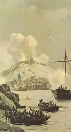 After Ployart had returned with the Swedes' rejection, Tordenskjold mounted an assault on the vessels and outworks which were defending the northern harbor inlet. The artillery galiot Johannes and the mortar barge Lange Maren fired the first rounds. Two barges, the Hjælperinden and the Fredrikshald were in reserve. The Swedish outworks consisted of Antonetta – equipped with four 6-pounder cannons and a crew of seven – and the Northern Blockhouse, a smaller outwork equipped with two 36-pounder guns. Captain Sjöblad had stationed an additional three cannons close to the Northern Blockhouse, which were served by 15 men. The outworks did not have enough ammunition and were commanded by NCOs. After firing at the outworks, with the help of a galley and eight sloops, 200–300 Danish soldiers were landed on Marstrand island and close to Antonetta.[19] After the Swedes had returned fire against the landing force, its guns were spiked and the crews retreated to Carlsten. The Northern Blockhouse suffered the same fate and so the Danes, commanded by Captains Kaas and Kleve, could rapidly enter the city. In the harbor, the Swedish frigate Kalmar and the galley Greve Mörner continued to defend the northern inlet until the Danish troops eventually entered the city.[20]