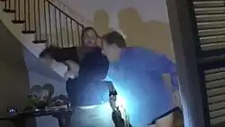 San Francisco police officers quickly arrived at the Pelosi residence[18] and knocked on the door at 2:31 a.m.[7][9] Pelosi opened the door.[7] From outside the house,[19] police observed DePape and Pelosi struggling for a hammer at the entryway.[20][21] In front of police, DePape took the hammer and attacked Pelosi with a single blow.[20][22][23] Released body camera footage of San Francisco police officers showed the door opening as DePape struggled with Pelosi. DePape grasped a hammer in one hand and Pelosi's arm in another; after an officer commanded him to drop the hammer, DePape responded "uh, nope" and lunged at Pelosi, swinging the hammer into his head.[10][24][25]