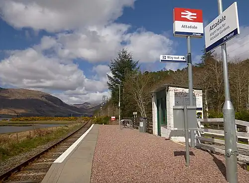 Attadale railway station is a remote railway station on the Kyle of Lochalsh Line, serving the village of Attadale on Loch Carron in the Highlands, northern Scotland. The station is 48 miles 22 chains (77.7 km) from Dingwall, between Strathcarron and Stromeferry.[4] ScotRail, who manage the station, operate all services.