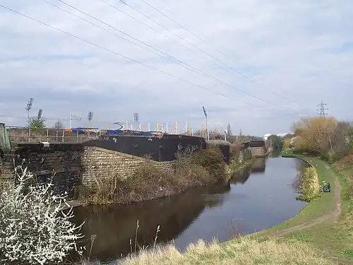 ![]() Attercliffe Station remains in 2009, seen from the Sheffield Canal, with the floodlights of the former Don Valley Stadium in the background. | |||||