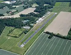 In the early years, flight operations were carried out with simple means: the 500-metre long runway running in a west–east direction had a grass surface and the air traffic control and the aero club were based in a wooden hut. In the 1960s, up to 40,000 visitors attended large-scale airshows with aerobatic performances, parachutists and even touch-and-go manoeuvres by jet aircraft. The airfield facilities were further expanded through the club members' own efforts without public funding. After the construction of the first hangars, the runway was extended to 800 metres and asphalted in 1980. In 1986 the tower was opened, followed by a new clubhouse in 1990.[1][2]