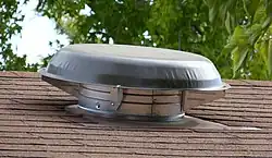 A powered attic ventilator, or attic fan, is a ventilation fan that regulates the heat level of a building's attic by exhausting hot air. A thermostat is used to automatically turn the fan off and on, while sometimes a manual switch is used. An attic fan can be gable mounted or roof mounted. Additional vents are required to draw in the fresh air as the hot air is exhausted. Attic fans are typically used in warmer months, when temperatures in an attic can exceed 120 °F (49 °C). A fan may be installed in an attic for the different purpose of cooling a whole house, venting hot air out via the attic; such fans are often called whole-house fans.