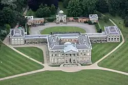 Attingham, including Cronkhill, was the seat of the Barons Berwick from the 1780s until that title became extinct in 1953. On the death of Thomas Henry Noel-Hill, 8th Baron Berwick (1877–1947), who died childless, the Attingham Estate, comprising the mansion and some 4,000 acres (1,600 ha), was gifted to the National Trust.[11][12] Attingham Park was designed by George Steuart, a follower of James Wyatt and encapsulated Tern Hall. It is the only remaining example of a country house by Steuart; he later designed St Chad's Church, Shrewsbury.[9] It was built from 1782 to 1785 for Noel Hill, 1st Baron Berwick. Lord Berwick, a former MP for Shropshire, received his title in 1784 during the premiership of William Pitt the Younger, during which he had been instrumental in the reorganisation of the East India Company.[10] The proportions have been criticised: for Simon Jenkins "The façade is uncomfortably tall, almost barracks-like, the portico columns painfully thin".[9] There is a large entrance court, with an imposing gatehouse, and two single storey wings stretch out to either side of the main block. The main reception rooms were divided into a male and female set on either side of the house.