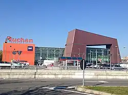 In the summer of 1967, on 20 August, Auchan opens its first hypermarket in Roncq in an initially commercial area of 3500 m2.[15] According to Gérard Mulliez, Roncq location served as a model for other hypermarkets in France in non-food enlargement.[16] On 27 March 1969 was opened the Englos-les-Géants shopping center at Englos in the Lille metropolis. Englos les Giants was the first shopping mall with a hypermarket and a retail park in France.[17]