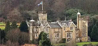 The original castle dates back to 1220 built by Sir Humphrey de Kirkpatrick when he was Senestal of Annandale.[3] The Kirkpatrick family, close allies of Robert the Bruce and King Robert would have been entertained at Auchen Castle often. The Kirkpatrick clan has long since moved from their seat at Auchen Castle and their estates and holdings came under the ownership of the Clan Johnstone.