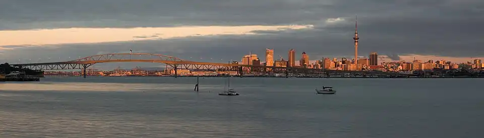 ![]() Auckland Harbour Bridge, seen from the North Shore looking toward Auckland City (2024). | |