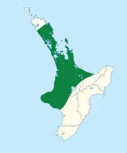 The species is found in the upper half of the North Island, except north of Whangaroa, as well as four of the islands of the Hauraki Gulf.[3]