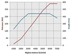The engine has increased crankcase breathing, a low-pressure fuel return system and a baffled oil sump, to prevent engine lubricant cavitation at high engine speeds and high-G cornering. It has four valves per cylinder (instead of five on the earlier variant) and two overhead camshafts on each cylinder bank (making it "quad cam"), which are driven by roller chains with variable valve timing[11] for both inlet and exhaust camshafts,[7] along with a cast magnesium alloy fixed tract length intake manifold with adjustable tumble flaps (to improve low engine speed combustion). On 98 RON (93 AKI) Super-Unleaded petrol it produces 309 kW (420 PS; 414 bhp) at 7,800 rpm,[7] giving it a specific power output of 74.2 kW (100.9 PS; 99.5 bhp) per litre.[8] Based on a kerb weight of 1,680 kg (3,704 lb), this results in a power-to-weight ratio of 0.184 kW per kg. Exhaust gas escapes through two '4-into-2-into-1' fan-branch steel exhaust manifolds and four high-flow catalytic converters,[7] into twin oval tail pipes with dynamic silencer/muffler valves. The engine is controlled by two Bosch DI-Motronic[12] electronic engine control units (working as 'master' and 'slave', because of the high-revving nature of the engine). The ignition system uses eight individual single-spark coils using mapped direct ignition.[7] The saloon version produces 322-329 grams of CO2 per kilometre (g/km),[7] and the Avant starts from 324 g/km.