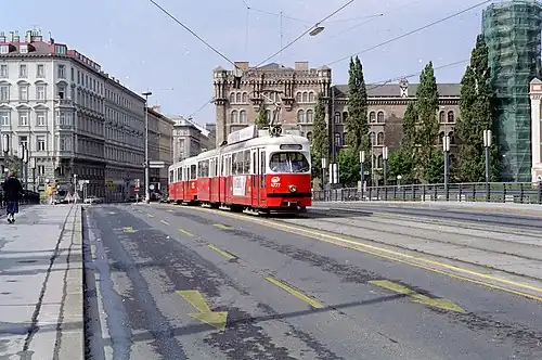 The bridge became part of the Vienna tram network in 1910, when the steam tram from Upper Donaustraße to Floridsdorf was replaced by an electric tram with its terminus at the Schottenring station (next to the Augartenbrücke). Line 331 to Stammersdorf and line 132 to Strebersdorf crossed the bridge (after 1982 these became lines 31 and 32). When Line U-6 of the U-Bahn was extended to Floridsdorf in 1996, Line 32 was abolished.