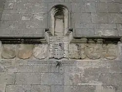 All Saints Church, Aughton is located at the far end of the village and overlooks vast expanses of the floodplains of the River Derwent. Tucked away in the village, it can only be accessed on foot through a small gate and field adjacent to Aughton Hall. An historic church, famous for its association with Robert Aske, leader of the insurgents in the Pilgrimage of Grace, October 1536. Aske was executed for treason on 12 July 1537.[3] The church displays a mixture of architectural designs as it has been altered throughout the years, but is noted especially for its Norman arch between the chancel and nave. On the chancel floor a well-preserved ancient brass of a knight in 15th century plate armour and his lady can be found, although much of the lady is now missing. Standing in the churchyard and looking up at the tower, (which was rebuilt by Christopher Aske sometime after 1536), a shield with six quarterings can be seen engraved on the outside wall, now badly weathered but it offers the following inscription in old French text: "Christofer le second filz de Robert Ask chr oblier ne doy, Ao Di 1536." This is literally translated as: "Christopher, the second son of Robert Aske, chevalier, ought not to forget the year of our Lord 1536." Also on the tower is a benchmark of the time and carved, in sunk relief, a newt or salamander otherwise known in Old English as an Ask.