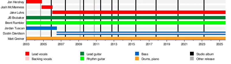 August Burns Red is an American metalcore band from Lancaster, Pennsylvania, formed in 2003. The band's lineup of guitarists John Benjamin "JB" Brubaker and Brent Rambler, drummer Matt Greiner, lead vocalist Jake Luhrs and bassist Dustin Davidson has remained consistent since 2006. The band was nominated for a Grammy Award in 2016 for Best Metal Performance for the song "Identity" from its 2015 release Found in Far Away Places, and again in 2018 for "Invisible Enemy" from Phantom Anthem (2017). The band has released ten studio albums to date; their latest, Death Below, was released in 2023.