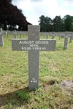 On 29 September 1943, Geiger was shot down by the Bristol Beaufighter VI of Wing commander Bob Braham of No. 141 Squadron RAF over the Zuiderzee, Netherlands.[31] Geiger and his radio operator Feldwebel Dieter Koch managed to bail out of their Messerschmitt Bf 110 G-4 (Werknummer 5477—factory number), but both drowned.[32][33][34] On 2 March 1944, Geiger was posthumously awarded the Knight's Cross of the Iron Cross with Oak Leaves (Ritterkreuz des Eisernen Kreuzes mit Eichenlaub), the 416th officer or soldier of the Wehrmacht so honored. He was buried at the German war cemetery Ysselsteyn (block M, row 4, grave 83) in the Netherlands.[29]