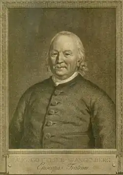 August Gottlieb Spangenberg (15 July 1704 – 18 September 1792) was a German theologian, minister, and bishop of the Moravian Church. As successor to Nicolaus Zinzendorf as bishop of the Moravian Church, he helped develop and lead international Moravian missions in colonial-era Province of Pennsylvania and stabilized Moravian theology and organization.