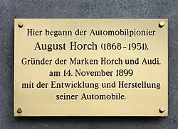 He was an honorary citizen of Zwickau and had a street named for his Audi cars in both Zwickau and his birthplace Winningen. He was made an honorary professor at Braunschweig University of Technology.[1] There is an August Horchstrasse (August Horch Street) at Audi's main manufacturing plant in Ingolstadt.