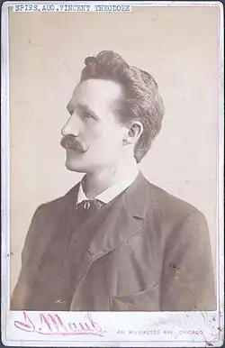 August Vincent Theodore Spies (/spiːs/, SPEES; December 10, 1855 – November 11, 1887) was an American upholsterer, radical labor activist, and newspaper editor. An anarchist, Spies was found guilty of conspiracy to commit murder following a bomb attack on police in an event remembered as the Haymarket affair. Spies was one of four who were executed in the aftermath of this event.