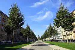 The Augustaanlage was named after the German Empress and Queen of Prussia, Augusta of Saxe-Weimar-Eisenach.[1] The part adjacent to the Friedrichsplatz was built in the first years after 1900. The development took place from the city to the east, the house numbers run accordingly. The avenue, planted with plane trees in two rows on a wide central strip, was laid out in the jubilee year 1907 (300 years of the city of Mannheim) for the Internationale Kunst- und großen Gartenbau-Ausstellung. With increasing development of the Oststadt, the street was extended eastward to its current length by the end of the 1920s. In 1935, the Reichsautobahn Mannheim-Heidelberg, today the Bundesautobahn 656, was reopened in the extension.