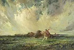 Kenderdine secured several portrait commissions, and in subsequent years exhibited his work across Canada, but was best known in Saskatchewan.[1] He seldom painted in watercolour, although he did several landscape studies in charcoal and wash in a style reminiscent of Gainsborough. His sweeping romantic depictions of the Saskatchewan landscape, especially around Emma Lake, were indelibly marked by his training in England and France. His imagery recast the province's topography in the comforting image of Europe. As a teacher he influenced generations of landscape painters, among them Wynona Mulcaster, Reta Cowley and Dorothy Knowles.