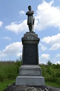 After the war, the citizens of Orange County raised money to erect a monument to the 124th Regiment at Gettysburg. Dedicated on July 2, 1884, it was the first regimental New York monument placed on the field. Located on Houck's Ridge where the regiment stood above the triangular field, the monument has a life-sized statue of Colonel Ellis, standing with his arms folded gazing calmly ahead.[10] It is the only official full-sized statue of a Union regimental commander at Gettysburg.[11]
