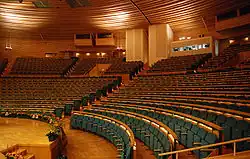 The design of the auditorium was inspired by the semi-circular plan of an ancient amphitheater. This is intended to allow the audience of 1,194 to perceive the speaker without electronic amplification. For this purpose, Erskine worked with the acoustic consultant Nils-Åke Nilsson. The wood ceiling has a steep slope towards the stage and powerful profiling to maximize the spread of the sound and avoid echoes. These solutions were also meant to provide an aesthetic sculptural effect. To achieve maximum sound diffusion, a steep slope was integrated into the design and care was taken to shape space and materials.