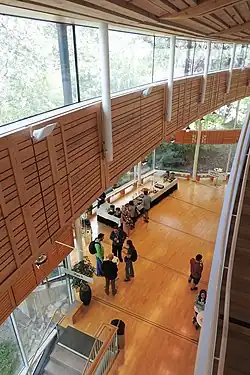 The building is built into the ground. From the north side and the main entrance it gives a low, modest impression, dominated by large glass surfaces. On the south side, the building is at its full height. Erskine breaks up the facade into many volumes of different size, structure and height in and interesting arrangement. The north facade is faced in brick in different shades of red brick, highly articulated with different surface textures. The roof, visible from a distance, features sun reflectors, typical of Erskine's style, which transmit daylight into the auditorium via skylights. The interior offers a vast panorama through the glass facade to the north which places the viewer in close contact with nature and the old oaks outside. Inside, the patterned brick walls return. The interior design has a natural feel through exposed bedrock in the lower foyer. The rustic lining of blonde woods is a characteristic feature throughout the building, presenting a warm contrast to the glass stone.[1]