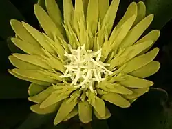 Aulax umbellata, the broad-leaf featherbush, is a shrub native to the Western Cape. It occurs on the lower slopes and coastal lowlands from Kogelberg to Mossel Bay up to altitudes of 500 m. The shrub grows with a single stem and grows up to 2.5 m tall. Umbellata means like an umbrella. The leaves have rounded tips and can become 110 mm long and 15 mm in diameter. The plant is bisexual, male and female flowers grow on different plants. The plants bloom from September to February. A variety of insect species help pollinate the plants. Female flowers dry out and form a woody shell in which the seeds are formed and preserved. Fires destroy the plant and only the seeds survive.