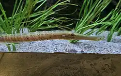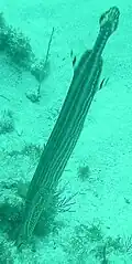 Aulostomus maculatus, the West Atlantic trumpetfish, is a long-bodied fish with an upturned mouth. It often swims vertically while trying to blend with vertical coral, such as sea rods, sea pens, and pipe sponges.