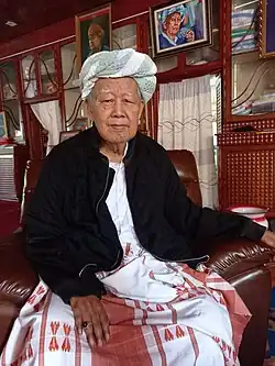 U Aung Kham Hti (Burmese: အောင်ခမ်းထီ) is a Burmese politician and former monk. He was the Chairman of the Pa-O National Organisation (PNO), which he re-organised in 1976. Its military wing, known as the Pa-O National Army was also headed by him. On 11 April 1991, the PNO, under his leadership, agreed a ceasefire with the ruling State Law and Order Restoration Council. The PNO was granted a number of business concessions and control over some territory in the southwest Shan State, which later became known as the Shan State (South) Special Region-6.[1] In April 2022, after the 2021 Myanmar coup d'état, Aung Kham Hti was awarded the title of Wunna Kyawhtin.[2]