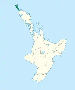 | Distribution of the Aupouri green gecko on a map of the North Island Known native range