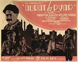 Aurat Ka Pyar (transl. "A Woman's Love") is a 1933 Indian film directed by A. R. Kardar.[1] The film was produced by the East India Film Company, in Calcutta. Kardar had moved from Lahore to Calcutta where he directed several films for the company from 1933–36, including Aurat Ka Pyar.[2] The music composer was Mushtaq Ahmed and lyrics were by Agha Hashar Kashmiri, who also scripted the film.[3] It starred Gul Hamid, Mukhtar Begum, Mazhar Khan, Anwari Bai, Bacha, Abdul Sattar and Athar.[4]