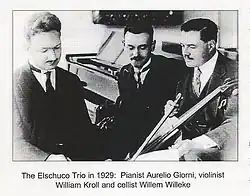 Aurelio joined the group in the summer of 1919 after Richard Epstein's death.[9] Late in 1919, Reber Johnson also played with the group briefly.[10] By 1920, Elias Breeskin had replaced Samual Gardner on violin.[11] Elias Breeskin left in 1921 and was replaced by William Kroll the following year, who stayed with the group until 1929, when he was replaced by Karl Kraeuter.
