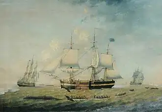 In 1805, Aurora rescued the crew of Maria, of Hull, Ross, master. Maria had been lost on the "Johns-a-Main". Two of Maria's crew died in an accident to one of Aurora's boats.[8][a] In addition to the 26 whales and 244 tons of oil, Aurora took nine tons of whale bone.[9]