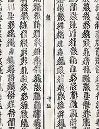 There are a number of characteristic features of the book indicating that it was printed using movable type, such as the gaps between the perimeter lines at the corners, and between the centre fold lines and the top and bottom perimeter lines, this being due to the print frame being made of loose pieces of wood rather being carved from a single block of wood as is the case with woodblock printing. Even more tellingly, characters are sometimes inverted, which is typical of books printed with movable type, but cannot accidentally occur in woodblock editions. That it was printed using wooden type rather than clay type is indicated by the occasional presence of uneven lines between the columns of characters, which were left by bamboo strips used to set the wooden type (but which were not used for setting clay type).[7]