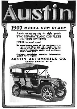 The Austin was a brass era American automobile manufactured in Grand Rapids, Michigan from 1901 to 1921. The company, founded by James E. Austin and his son Walter Austin, built large, expensive and powerful touring cars with an unusual double cantilever rear spring arrangement placing the rear wheels behind (sometimes well behind) the passenger compartment, for a longer wheelbase to improve rider comfort in an era of rough roads[1] as well as a unique two-speed rear axle.[2]