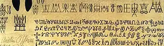 Spare "elaborated his sigils by condensing letters of the alphabet into diagrammatic glyphs of desire, which were to be integrated into postural (yogalike) practices—monograms of thought, for the government of energy." Spare's work is contemporaneous with Hugo Ball's attempts "to rediscover the evangelical concept of the 'word' (logos) as a magical complex image"—as well as with Walter Benjamin's thesis that "Mediation, which is the immediacy of all mental communication, is the fundamental problem of linguistic theory, and if one chooses to call this immediacy magic, then the primary problem of language is its magic. Spare's 'sentient symbols' and his 'alphabet of desire' situate this mediatory magic in a libidinal framework of Tantric—which is to say cosmological—proportions."[79] (An alphabet of desire modelled after Spare's ideas has since been developed by Peter J. Carroll amongst others, especially in his influential Liber Null, a sourcebook of chaos magic.)