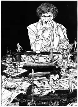 Soon, he began studying at the RCA, but was dissatisfied with the teaching he received there, becoming a truant and being disciplined by his tutors as a result.[11] Influenced by the work of Charles Ricketts, Edmund Sullivan, George Frederic Watts and Aubrey Beardsley, his artistic style focused on clear lines, which was in stark contrast to the College's emphasis on shading.[12] Still living in his parents' home, he began dressing in unconventional and flamboyant garb, and became popular with other students at the college, with a particularly strong friendship developing between Spare and Sylvia Pankhurst, a prominent Suffragette and leftist campaigner.[13]