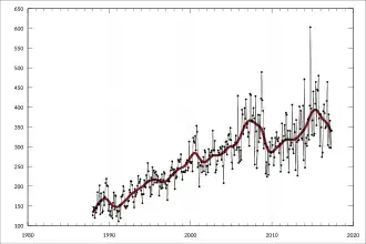 Australia's trade with Taiwan in 1993 amounted to $5.1 billion, while trade with the PRC was slightly greater at $5.2 billion.[32] In 1992, Taiwan was Australia's fourth-largest Asian trading partner and seventh most important overall.[32] Despite Taiwan's inability to conclude multilateral treaties, Australia has concluded various bilateral agreements with Taiwan. This includes establishing direct air links with Taiwan in 1991, which saw an increase in tourism resulting in Taiwan becoming Australia's third largest market in Asia.[32] The period to receive an Australian visa in Taiwan was reduced to 48 hours,[30] and a memorandum of understanding was agreed relating to 'the promotion of investment and technology transfer and to the protection of intellectual property'.[32]