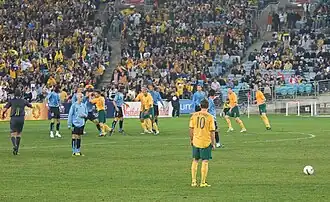 The Australia–Uruguay association football rivalry is a historical rivalry between the Australian and Uruguayan national teams that dates back to 1974[2][3] when Uruguay travelled to Australia for a 2-game series before Australia departed for the 1974 FIFA World Cup. Despite Australia performing well in both matches, they were marred with foul play by the Uruguayans, which left Australian forward Ray Baartz suffering a stroke after having his carotid artery damaged following an incident with Luis Garisto.[4] The incident caused Baartz to miss the World Cup and retire from the game for health concerns. Between 2001 and 2005 the rivalry would come to the forefront of Australian and Uruguayan relations as both nations played each other in consecutive FIFA World Cup play-off matches. Uruguay would win the 2001 play-offs for the 2002 FIFA World Cup, whilst Australia would win the 2005 play offs for the 2006 FIFA World Cup, which has been called the best moment in Australian sporting history as Australia qualified for the World Cup finals for the first time in 32 years.[5][6] To date, the two nations' women's national teams are yet to play each other.