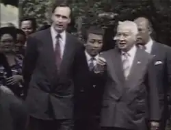 The avowedly anti-communist stance of new President Suharto and his "New Order" government was a point of common cause with successive Australian governments.[34] Australian foreign minister Paul Hasluck visited Indonesia to meet Suharto three times between August 1966 and January 1968 before Suharto's formal appointment as President of Indonesia in March 1968.[35] Australian prime minister John Gorton then visited Jakarta in June 1968, making only the second visit by any Australian prime minister to Indonesia.[36] Suharto made his first visit to Australia in 1972, and met with Prime Minister William McMahon.[37] Following his election in December 1972, Gough Whitlam met President Suharto in Yogyakarta in September 1974[38] and told him that he did not support East Timor's independence, claiming that it would destabilise the region.[39] The leaders again met in Townsville in 1975, Suharto's last visit to Australia.[40]