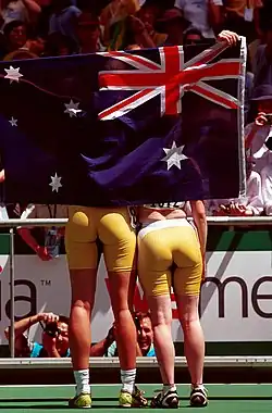 In addition, the Games were utilised as a platform to showcase the culture of Indigenous Australian peoples to participants and audiences from different nations.[31] The culture of the Aboriginal and Torres Strait Islander peoples was described to be "rich", and the SOCOG worked in close collaboration with their communities to display their culture on a global scale, with the attempt to be inclusive in their approach.[31] The SOCOG also worked towards actively engaging Indigenous communities during the Games, to provide them with commercial, promotional, employment, ceremonies and cultural design opportunities.[31] This was actioned by its establishment of a National Indigenous Advisory Committee, which was delegated the responsibility to monitor and review the "cultural content, themes, materials and protocol" with respect to the events.[31] These events ranged from Olympics ceremonies, the Volunteers program, Olympics Arts Festivals, "traditional welcoming ceremonies" to the Olympic Youth Camp.[31] In particular, the Torch Relay was described to have paid a tribute to "many significant" and sacred Indigenous sites.[31] The Relay event both commenced and concluded with the recognition of Aboriginal athletes Nova Peris-Kneebone and Cathy Freeman, respectively.[31] Additionally, in the opening ceremony of the Paralympic Games, the torch was carried by an Indigenous athlete and wheelchair basketball player named Kevin Coombs.[32] Coombs had participated in the first Paralympic Games held in Rome in 1960 and was also assigned the role of serving as team captain during the 1980 Games.[32]
