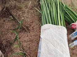There are various examples of sculptural fibre works in pre-contact Aboriginal societies. Among the Rembarrnga people of Central Arnhem Land, sculptural fibre objects are a central feature of ceremony. Participants dance with animal figures, which are constructed by binding a core of paperbark or grass with string made from bark or other fibres.[2] Thus a dancer may take on the identity of the Ancestor figure.[3] Djondjon or djawurn-djawurn figures from central and western Arnhem Land have a similar construction, but depict human forms. These were left behind at campsites which people had vacated. A longer or raised arm indicated to others the direction in which the group had gone.[4]