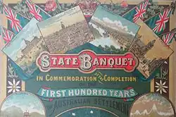 The following year, 1838, was the 50th anniversary of the founding of the colony, and as part of the celebrations Australia's first public holiday was declared. The regatta was held for a second time, and people crowded the foreshores to view the events, or joined the five steamers (Maitland, Experiment, Australia, Rapid, and the miniature steamer Firefly) to view the proceedings from the water. At midday 50 guns were fired from Dawes' Battery as the Royal Standard was raised, and in the evening rockets and other fireworks lit the sky.[34] The dinner was a smaller affair than the previous year, with only 40 in attendance compared to the 160 from 1837,[33][34] and the anniversary as a whole was described as a "day for everyone".[29]
