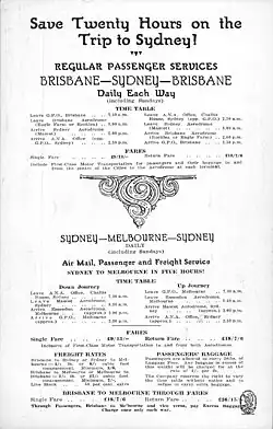 The company operated a regular passenger and airmail service between Brisbane, Sydney and Melbourne that was in January 1931 extended to Launceston and Hobart in Tasmania.[3] Unable to obtain a formal mail subsidy, the deepening Great Depression saw revenues fall, a situation that worsened after the crash of VH-UMF Southern Cloud in the Australian Alps between Sydney and Melbourne on 21 March 1931. ANA ceased scheduled services at the end of June 1931,[4] although it continued to operate joy flights mostly around New South Wales,[5] and offered pilot training services with a fleet of small aircraft.[6]