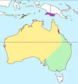 The Australian boobook is found across mainland Australia, although it is scarce in more arid regions such as western New South Wales, southwestern and western Queensland, much of South Australia away from the coast and interior Western Australia and Northern Territory. In drier areas, it is generally found along watercourses such as the Darling and Paroo Rivers, and Lake Eyre Basin. It is found on numerous offshore islands such as Groote Eylandt, Melville Island, Mornington Island in the Gulf of Carpentaria and many islands off eastern Australia.[42] It is found in southern New Guinea, Timor and surrounding islands in Indonesia. It is found in a wide range of habitats, from forest and open woodland to scrubland and semidesert areas. In Australia, it resides in mainly eucalypt forests. It has adapted to landscapes altered by human activity and is found in farmland and suburban areas as long as some scattered trees are present.[25]