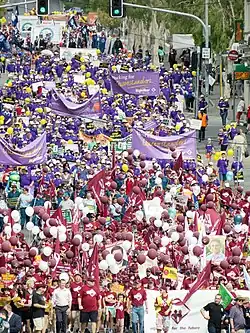 To begin industrial action for an "employee claim" it must be against a single-business enterprise, rather than multiple employers, it cannot even be part of so called "pattern bargaining" seeking the same agreements across different enterprises, and it must not be taken before an enterprise agreement has expired.[145] The union must get permission from the FWC to do a protected action ballot, and the FWC must grant an order where the union has a majority support determination and is "genuinely trying to reach an agreement" by negotiation.[146] The ballot must state what kinds of action are proposed, and be overseen by the Australian Electoral Commission or an independent agent, and over 50% must turn out to vote, with over 50% being in favour of action.[147] A union then must then give notice of three days to the employer, and start action within 30 days, or get an extension for another 30 days from the FWC, though action may continue indefinitely until there is agreement or the bargaining period is terminated.[148] Protected industrial action is immune from liability in tort, so long as there is no personal injury, property damage or defamation.[149] However if industrial action is taken that is unprotected, the FWC must issue a "stop order", which may be backed by an injunction of the Federal Court, and ultimately sanctions for contempt of court including prison.[150] There is a four hour pay penalty for unprotected action, and by law workers may not be paid during industrial action.[151] Where duties are partially performed, at common law there is an obligation to pay for work accepted,[152] unless the employer makes clear they will not accept partial performance,[153] a position which encourages all out strikes and exacerbates disputes. Moreover, employers who cannot reasonably operate broken machinery, or is facing a closure from strikes, can stand down employees without pay.[154] Even where industrial action is protected and valid, the FWC still has jurisdiction to suspend or terminate action if it threatens significant economic harm on application of a union or a federal or state Minister, if it threatens life, safety, health, welfare or part of the Australian economy, if a cooling off period would "assist in resolving the matters at issue", or if there is significant harm to a third party.[155] For instance, in the 2011 Qantas industrial disputes, the Minister intervened to get a stop order to suspend a pilot strike at Qantas, given the impact on the national tourism industry.[156] Secondary boycotts have been banned since 1977,[157] so that unions cannot take action in solidarity with workers in different workplaces, even where anti-productive competition is driving pay down in a race to the bottom across a whole sector. The ban is enforceable by the Australian Competition and Consumer Commission regardless of whether the parties to a dispute pursue a complaint.[158] It is not yet clear that self-employed workers have the right to take collective action,[159] although under international law, the right to act and strike is guaranteed for "everyone".[160]