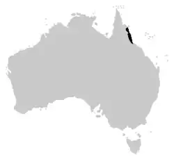 This species ranges from Paluma to Cooktown in northern Queensland. It is associated with fast-flowing creeks in montane rainforests of altitudes ranging from 0–1,200 m (0–3,937 ft). But can also be found around slower watercourses and rock soaks when ample vegetation is present.[1] They breed from spring to summer with peak breeding occurring from October to April. Males call while on low foliage or rocks close to the stream, and have has two distinct calls. A drawn-out "eeeeeeee" repeated three or four times in concession is made when calling in a group and when calling alone a short "ee" is made every 4–5 seconds. Eggs are large and unpigmented and are laid in clumps of up to 100 attached to submerged objects.[3]