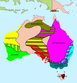 Tarra-won-nang,[12] or djarrawunang, wibung, and marriyang were names used by the local Eora and Darug inhabitants of the Sydney Basin.[15] Booroogong and garoogong were Wiradjuri words and Victorian terms included carrak (Jardwadjali),[16] kuruk (Western Victorian languages), kiri (Dhauwurd Wurrung language) and kurikari (Wuluwurrung).[17] Among the Kamilaroi, it is burrugaabu,[18] galalu, or guluu.[19] In Western Australia it is known as warndurla among the Yindjibarndi people of the central and western Pilbara,[20] and koorlbardi amongst the south west Noongar peoples.[21] In South Australia, where it is the State emblem, it is the kurraka (Kaurna), murru (Narungga), urrakurli (Adnyamathanha), goora (Barngarla), konlarru (Ngarrindjeri) and tuwal (Bunganditj).[22]