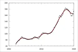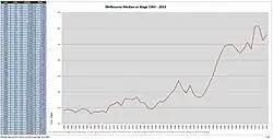 The residential housing market has seen drastic changes in prices in the past few decades. The property prices are soaring in major cities like Sydney, Melbourne, Adelaide, Perth, Brisbane and Hobart.[3] The median house price in Sydney peaked at $780,000 in 2016.[4] However, with stricter credit policy and reduced interest from foreign investors in residential property, prices have started falling in all the major cities.[5] When compared with the soaring prices of 2017, the housing prices fell by 11.1% in Sydney and 7.2% in Melbourne in 2018.[6] In 2022 the residential rental market has seen a significant increase in rents, which has been described as a 'rental crisis'.